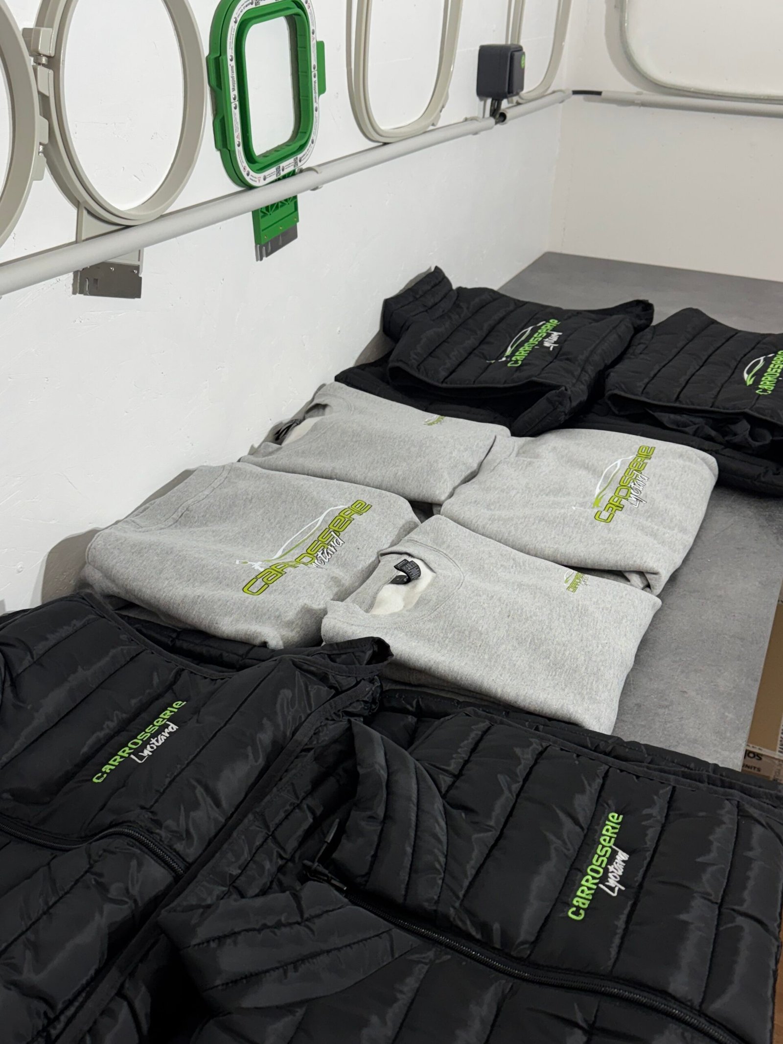 Des aperçus de nos impressions textiles personnalisées, stickers vinyle, roll-up et broderie.