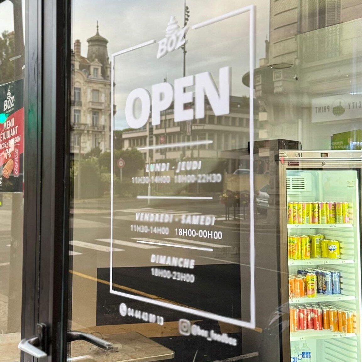 The image depicts an interior of a photo processing or printing shop. Prominent signs and advertisements adorn the counter, including a large 'NEW OFFERS' poster and branding for Kodak Express. Various smaller items and details surround the counter area, including business cards, product brochures, and sample photos. The setting has a warm, sunlight filter casting shadows across the space, highlighting the text and images.