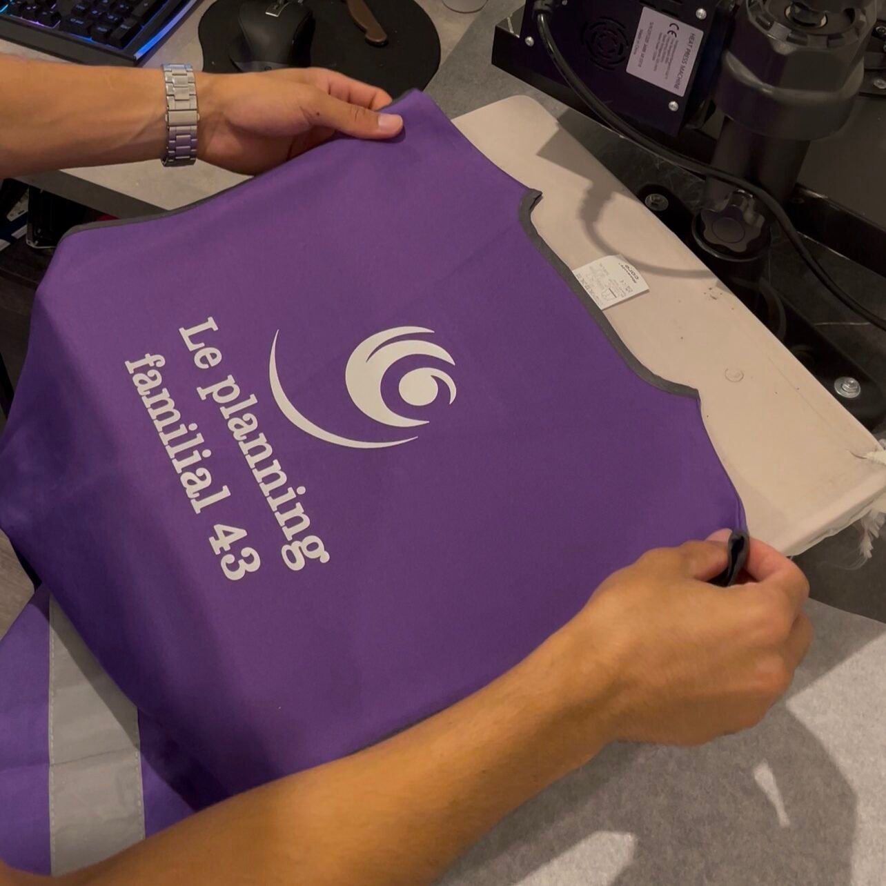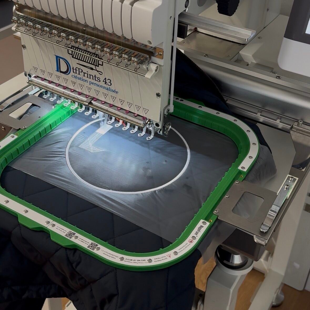 A detailed close-up of a colorful embroidered pattern featuring geometric shapes. The design includes vibrant reds, blues, and soft pinks, outlined with black stitching on a light fabric background. The texture of the embroidery is prominently visible, showing fine details of the individual threads.